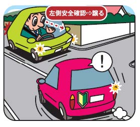 初心運転者は、右折時や合流時のタイミングがうまくとれないことがあります。交差点で右折しようとしている初心運転者標識表示自動車があるときは、停止をしても後続車に追突されるおそれがなく、かつ、自車の左側から接近してくる二輪車などもいない場合には、停止して初心運転者標識表示自動車を先に右折させてあげましょう。合流時も同様です。