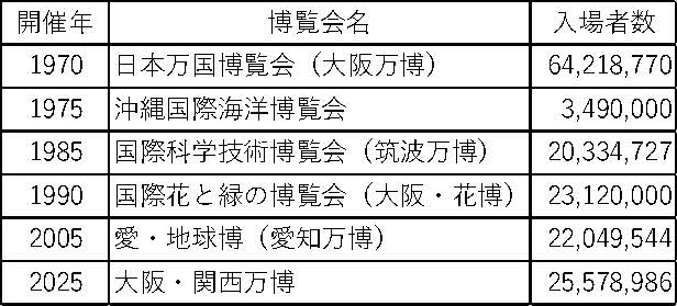 下表は日本で開催された博覧会の累計入場者数です。概ね2,000万人前後が来場していますが、1970年の大阪万博は6,400万人が訪れ、2010年の上海万博(約7,300万人)に次ぐ世界第2位の記録となっています。