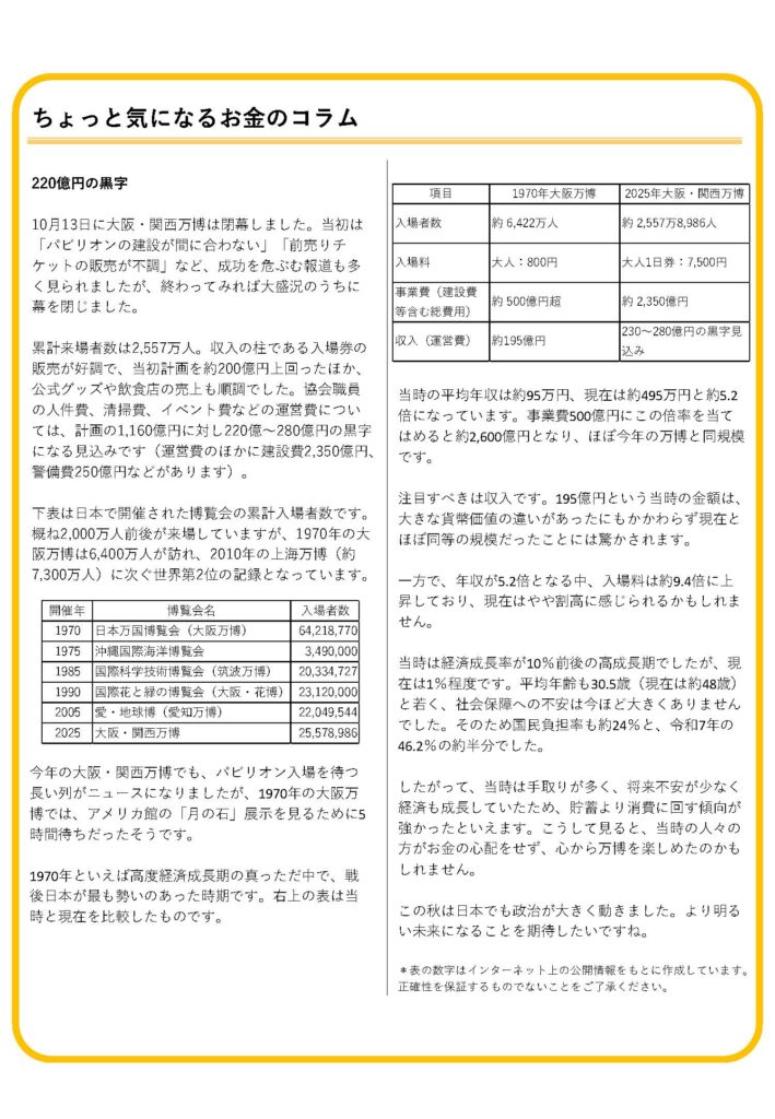 大阪・関西万博は2500万人を超える来場があり盛況のうち幕を閉じました。55年前の大阪万博の来場者は約6400万人、運営黒字額は195億円でした。