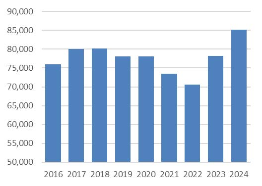 近年、物価上昇やクレジットカード利用の増加により、家計のバランスがくずれやすい状況が続いています。下図は、裁判所が受け付けた自己破産件数の推移を示したものです(司法統計より作成)。