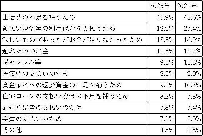 2番目に多い「後払い決済等の利用代金の支払いのため」には、リボ払いがきっかけで多重債務に陥ったケースなどが含まれます。リボ払いは月々の支払いを小さく見せますが、返済期間が長くなるため、利息を含めた支払総額は大きく膨らんでしまいます。