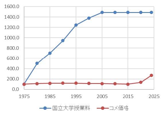 令和の米騒動などと騒がれているコメ価格は50年前と比べて約2.7倍程度です。それに対して国立大学の授業料は約15倍になっていることがわかります。
