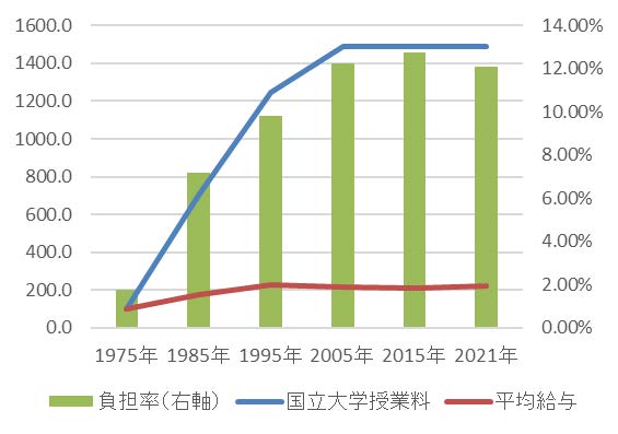 学費が上がってもその分給料が上がっていればよいのですが実際にはそのようにはなっていません。下図は同じく1975年を100とした時の国立大学授業料と日本人の平均給与、そして給与に占める授業料の割合を示したものです。