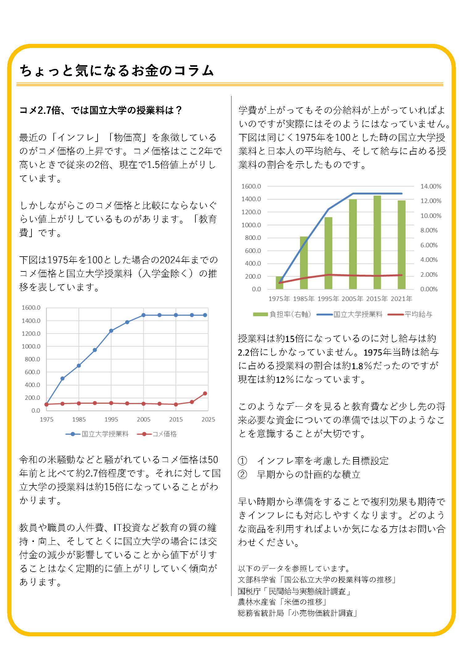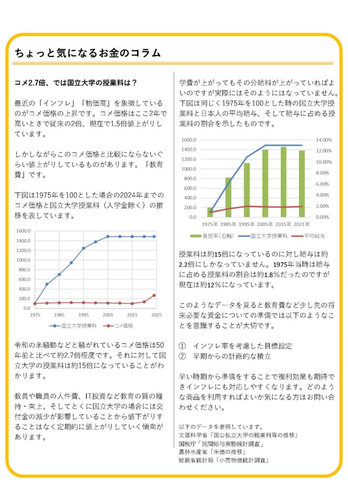この2年ほどでコメ価格は2倍まで値上がりしましたが、大学授業料などの教育費はそれと比較にならないほど値上がりしています。インフレも考慮した早めの準備が大切です。