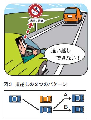 追越しとは、進路を変えて、進行中の前の車の前方に出ることをいい、図3のAとBの2つのパターンがあります。片側1車線の道路で、対向車線にはみ出して追越しをする場合はAになり、片側2車線以上の道路では、AかBのいずれかになります。