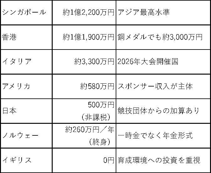 下表は各国の報奨金比較です(各国オリンピック委員会などを参照。なお、すべての国を網羅しているわけではありません)。