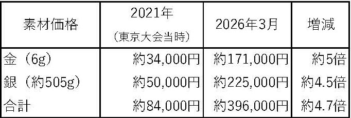 2026年3月現在の金価格(約28,500円/g)・銀価格(約450円/g)で試算すると、東京大会型(金6g・銀505g)の金メダル1枚の素材原価は約39万6,000円。金・銀価格の高騰を受け、2021年の東京大会時の約8万4,000円から実に約4.7倍に膨らんでいます。