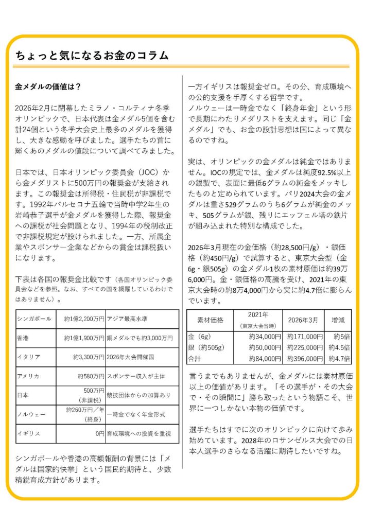 ミラノ・コルティナ冬季オリンピックで日本人選手は多くのメダルを獲得しました。金価格の上昇が話題になっていますが、金メダルの価格はどうなったでしょうか?